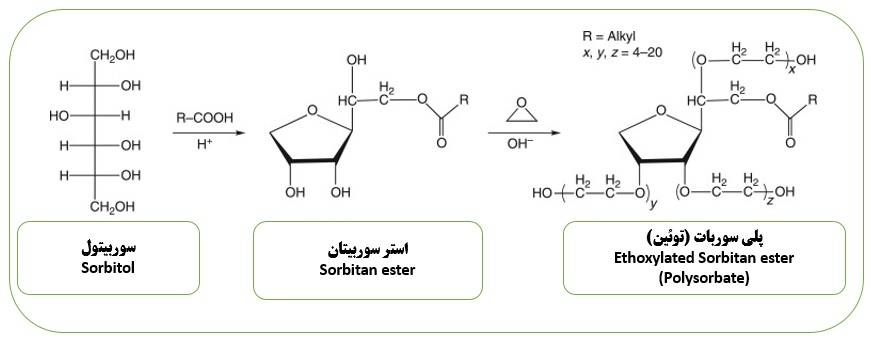 همانطور که در بالا اشاره شد توئین ها از اتوکسیلاسیون استرهای اسید چرب سوربیتان تهیه میشود. برای اطلاع از ترکیبات استرهای سوربیتان وارد لینک زیر شوید :